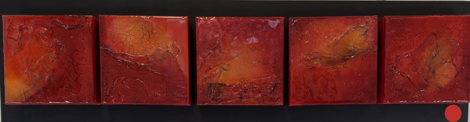 „Roter Takt“ besteht aus fünf kleinen Tafeln – nebeneinander gereiht, wie Herzschläge in Farbe.